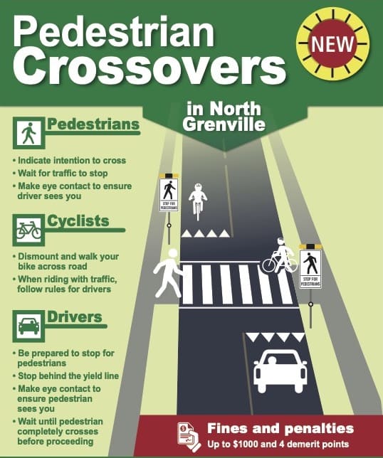 Pedestrian crossovers (PXO’s) are a new way for pedestrians & cyclists to easily and safely cross the road. By law, drivers and cyclists must stop and yield to pedestrians intending to cross the road, and wait for them to completely reach the other side before driving. Pedestrian Crossovers are marked by signs and pavement markings.