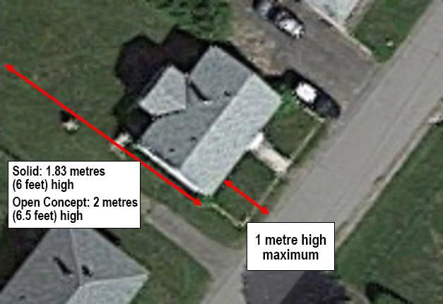 - From the front of the footprint of the residence to the front of, along the front of the lot, the height is limited to 1 metre (3 feet) in height. See photo sample here.