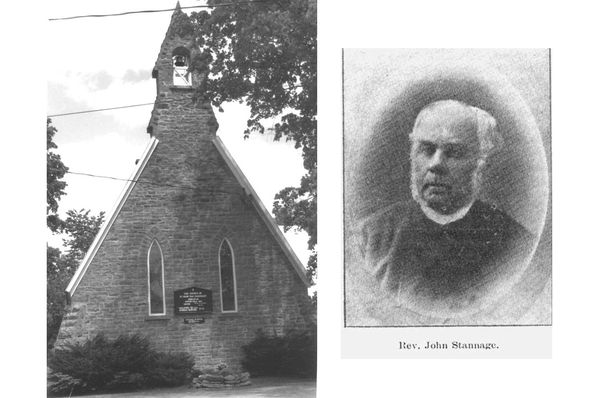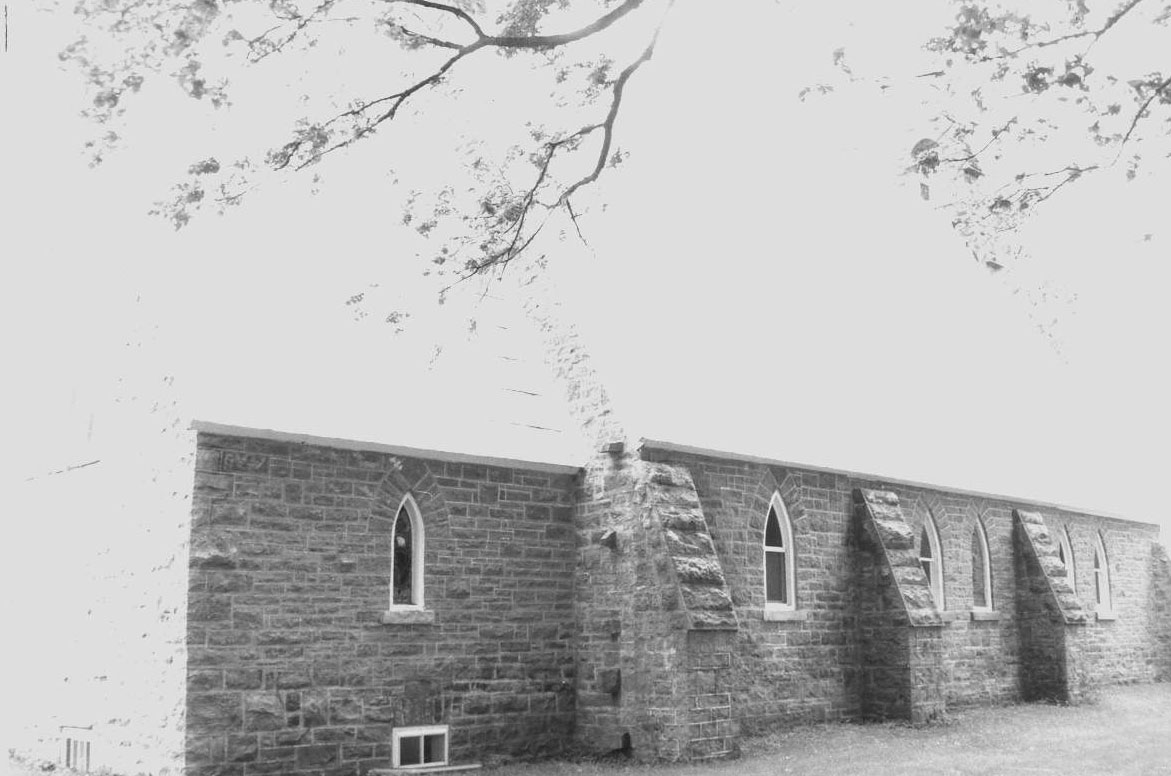 St John the Evangelist Church in Oxford Mills is recommended for designation as being of architectural and historical value. This one-storey building was constructed of stone which was quarried at the nearby Harris Quarry1 on Bedell Road, and was hauled to the site by the local parishioners. Prior to that, in 1866, church services were held in the village on weekdays by Reverend H. L. Jones, a Curate under Reverend J. Stannage, the Rector of Kemptville. According to Reverend Stannage’s diary in 1867 “the people of Oxford Mills, where I go every fortnight, have raised $600.00 towards a church, and a building committee has been appointed, and they are about to secure a site. They agreed upon a site, and hauled the stone upon it giving their work gratuitously.” The building committee consisted of “Messrs. Chas. Jones, Joseph Todd and Jas Maley.”